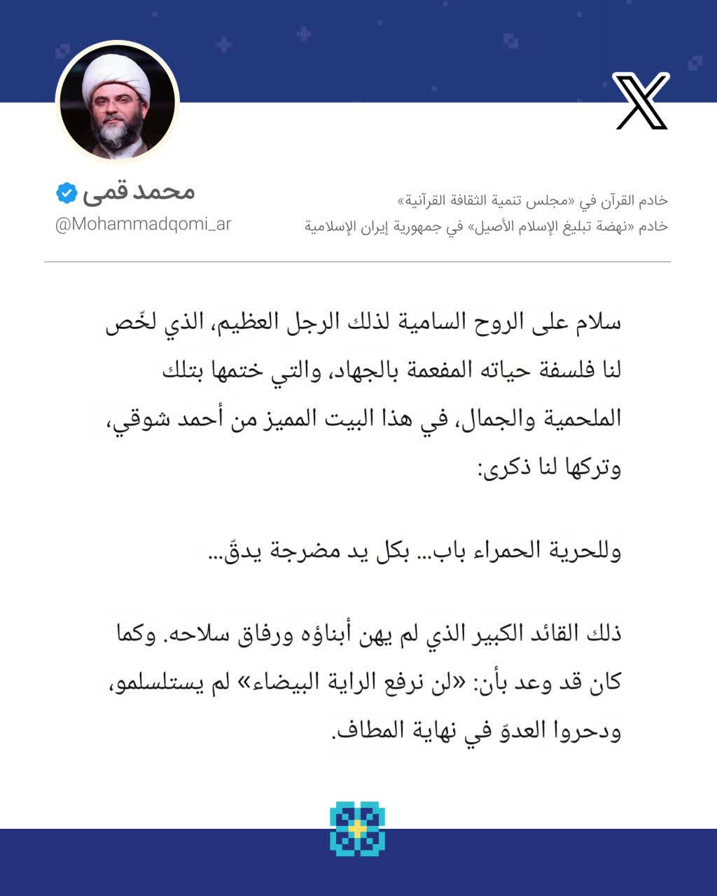 حجتالاسلام محمد قمی، رئیس سازمان تبلیغات اسلامی در سالروز شهادت یحیی سنوار در صفحه شخصی خود در شبکه اجتماعی ویراستی نوشت؛ سلام بر روح بلند بزرگمردی که در زندگیِ سراسر جهادِ خود تسلیم نشد و دشمن را عقب راند.
