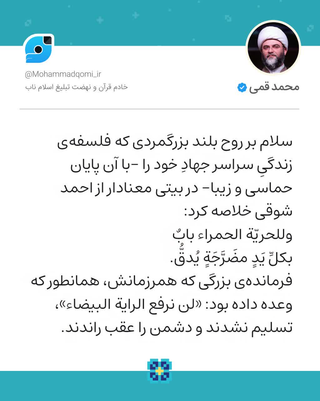 ۲۵ مهر | حجتالاسلام محمد قمی به مناسبت سالروز شهادت یحیی سنوار نوشت؛
