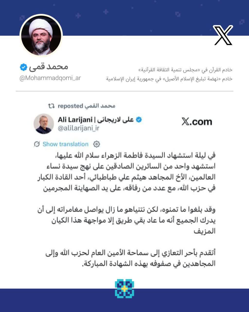 حجت‌الاسلام محمد قمی، رئیس سازمان تبلیغات اسلامی در پی ترور و شهادت فرمانده ارشد و مجاهد حزب‌الله پیروز، شهید هیثم علی طباطبایی در شب شهادت حضرت صدیقه طاهره (س)، توئیت عربی دکتر علی لاریجانی دبیر شورای عالی امنیت ملی را بازنشر کردند.