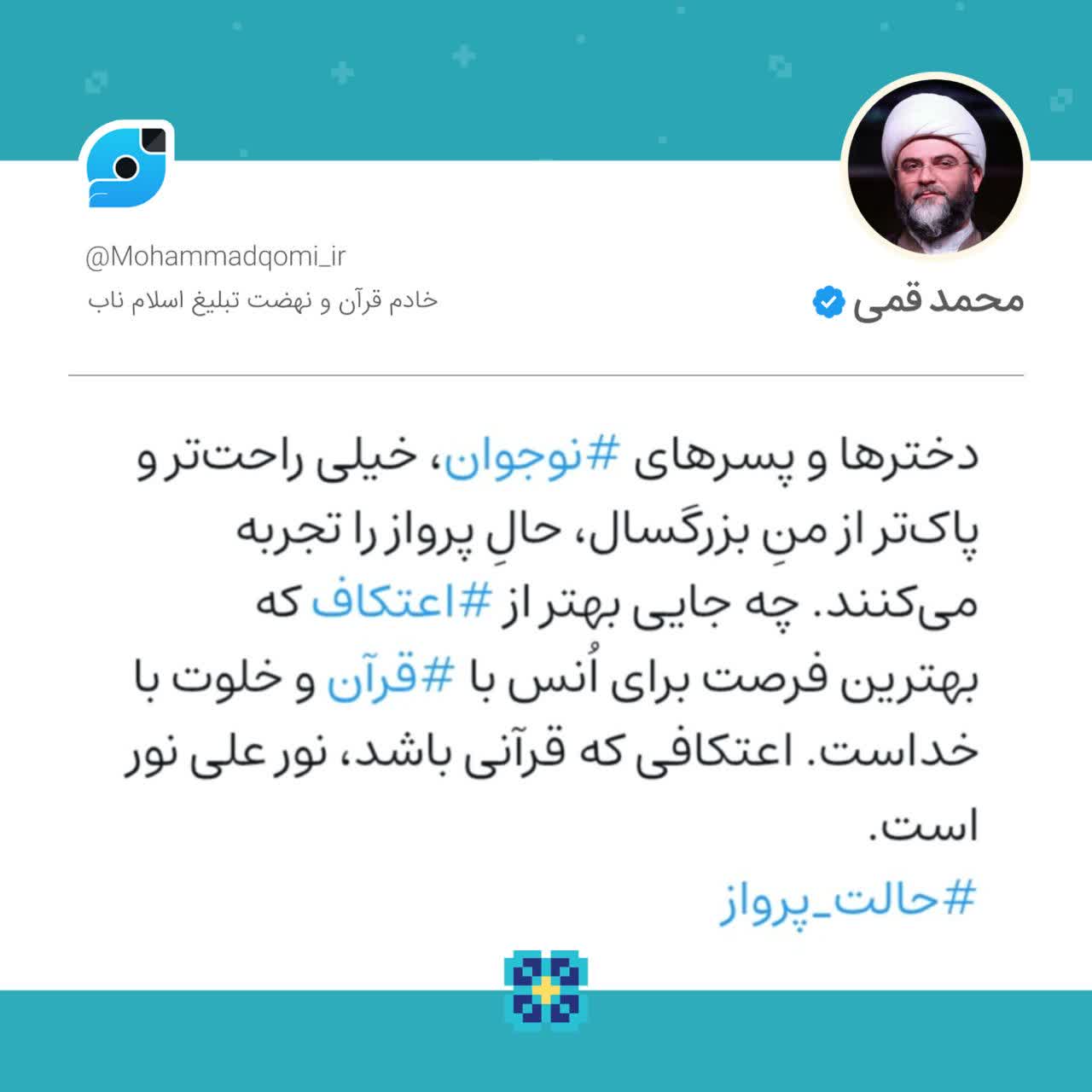 رئیس سازمان تبلیغات اسلامی نوشت؛ دخترها و پسرهای نوجوان، خیلی راحتتر و پاکتر از منِ بزرگسال، حالِ پرواز را تجربه میکنند. چه جایی بهتر از اعتکاف که بهترین فرصت برای اُنس با قرآن و خلوت با خداست. اعتکافی که قرآنی باشد، نور علی نور است.