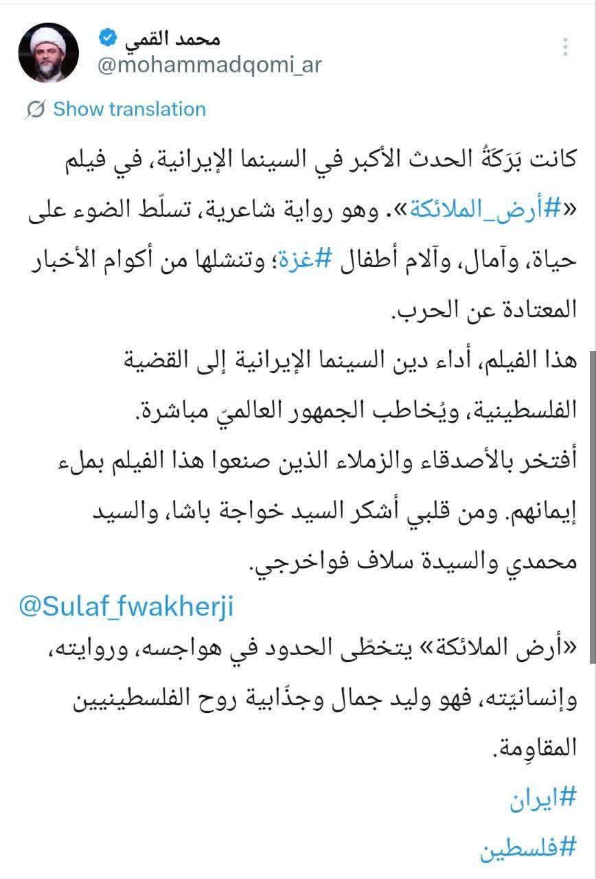 رئیس سازمان تبلیغات اسلامی، با انتشار توییتی در صفحه شخصی خود در شبکه اجتماعی ایکس ویژه مخاطبان عرب زبان نوشت؛ برکت بزرگ‌ترین رویداد سینمای ایران، «سرزمین فرشته‌ها» بود؛ روایتی شاعرانه که زندگی، امید و رنج کودکان غزه را از دل انبوه خبرهای تکراری جنگ بیرون می‌کشد.