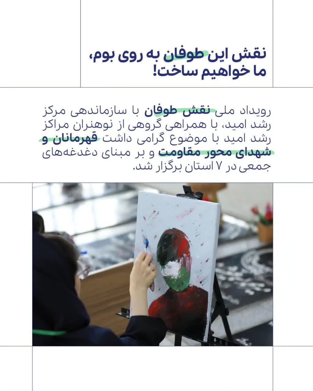 پویش ملی «نقش طوفان» با حضور حدود ۲۰۰ نوجوان هنرمند در استانهای مختلف کشور برگزار شد.