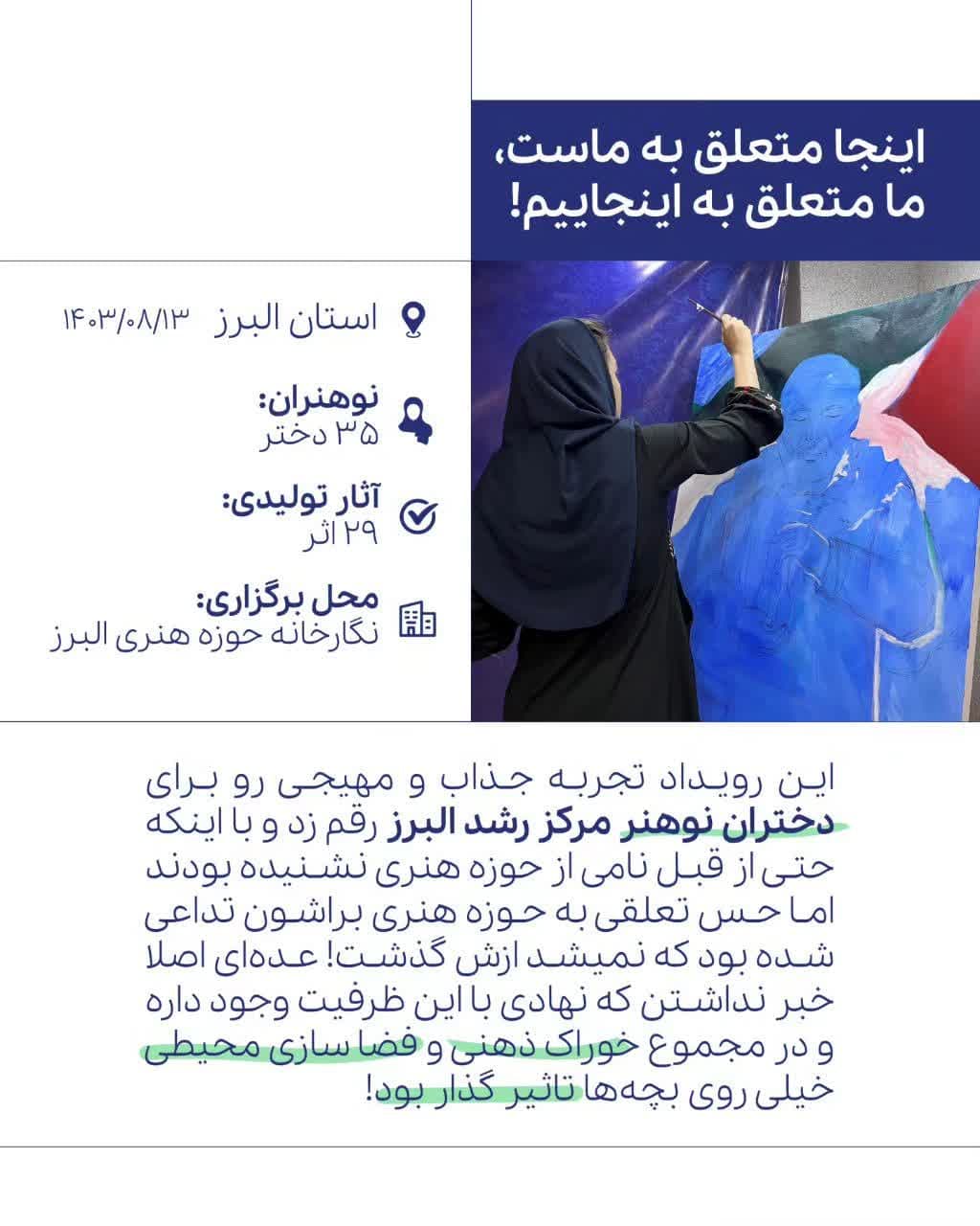 در این رویداد که روایتی از کنشگری نوجوانان هنرمند تجسمی مراکز رشد امید در ۷ استان بود، با مشارکت بیش از ۱۶۴ نفر، ۱۵۲ اثر هنری تولید شد که در مجموع ۲۷ اثر به عنوان برگزیده در این رویداد ملی انتخاب شد.