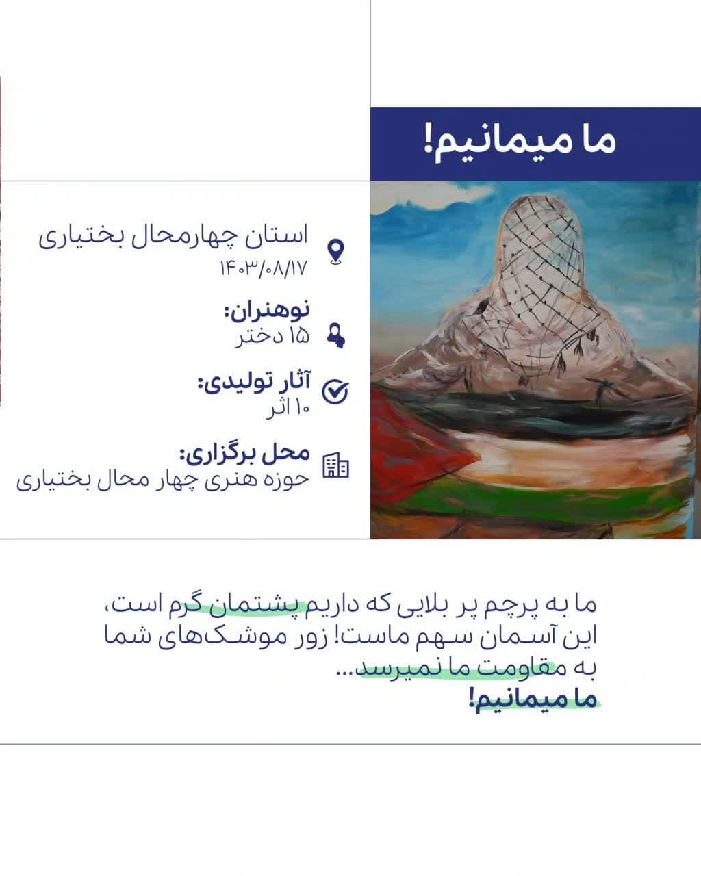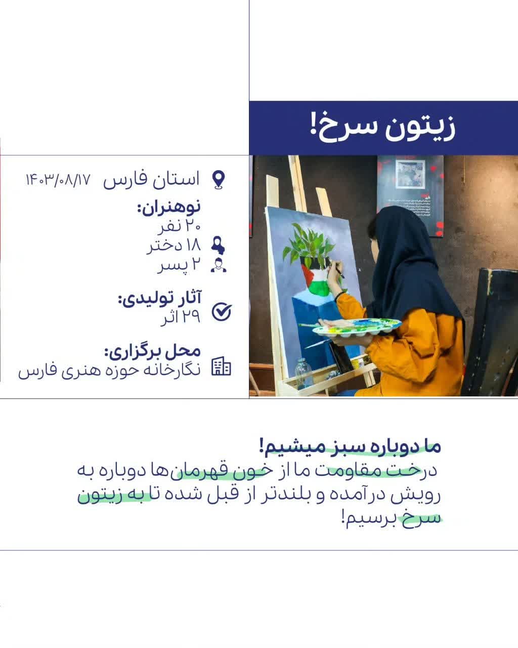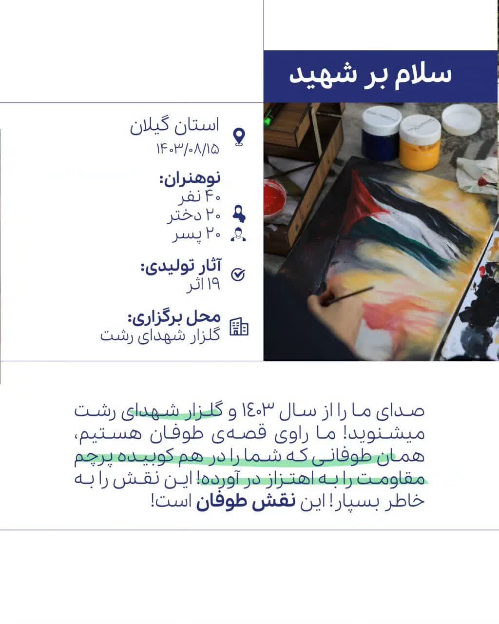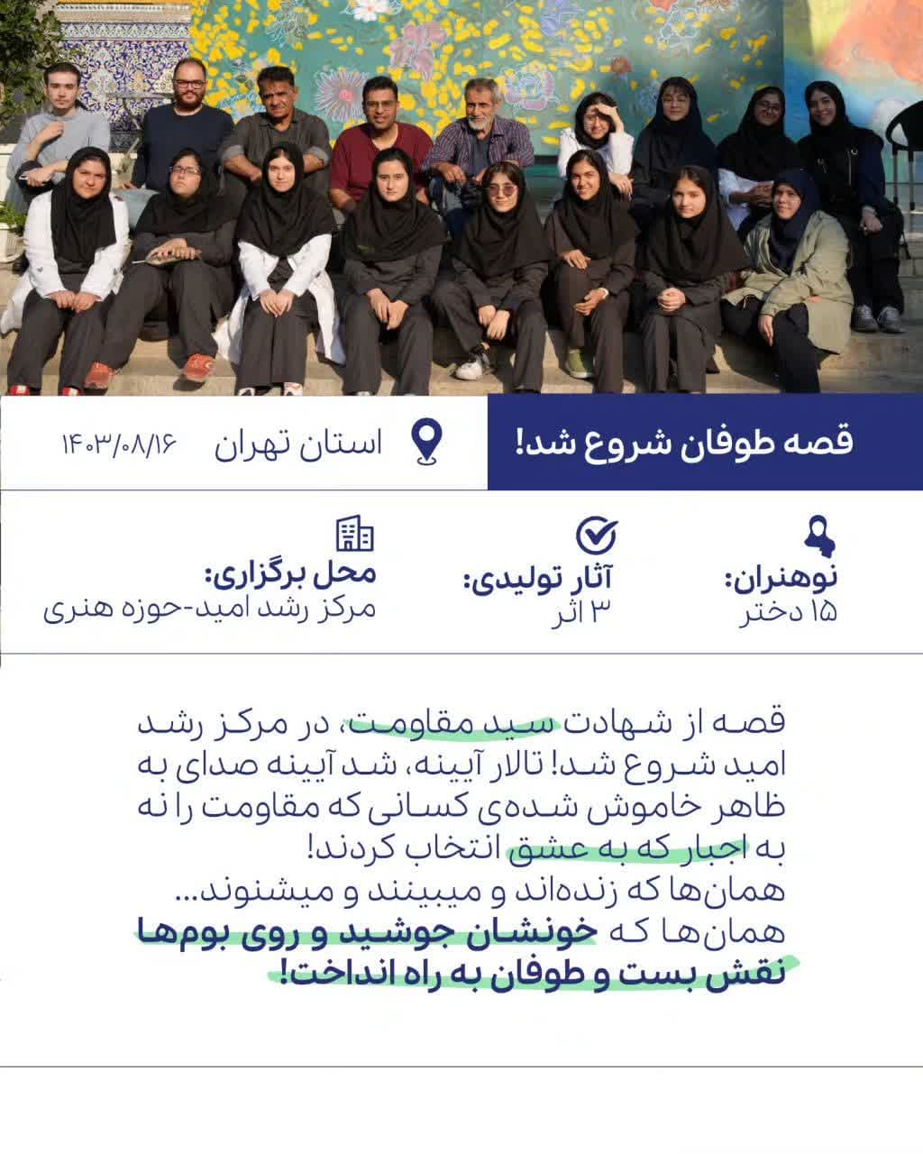 این رویداد با سازماندهی مرکز رشد امید، با همراهی گروهی از نوهنران مراکز رشد امید با موضوع گرامیداشت قهرمانان و شهدای محور مقاومت و بر مبنای دغدغههای جمعی در 7 استان برگزار شد.