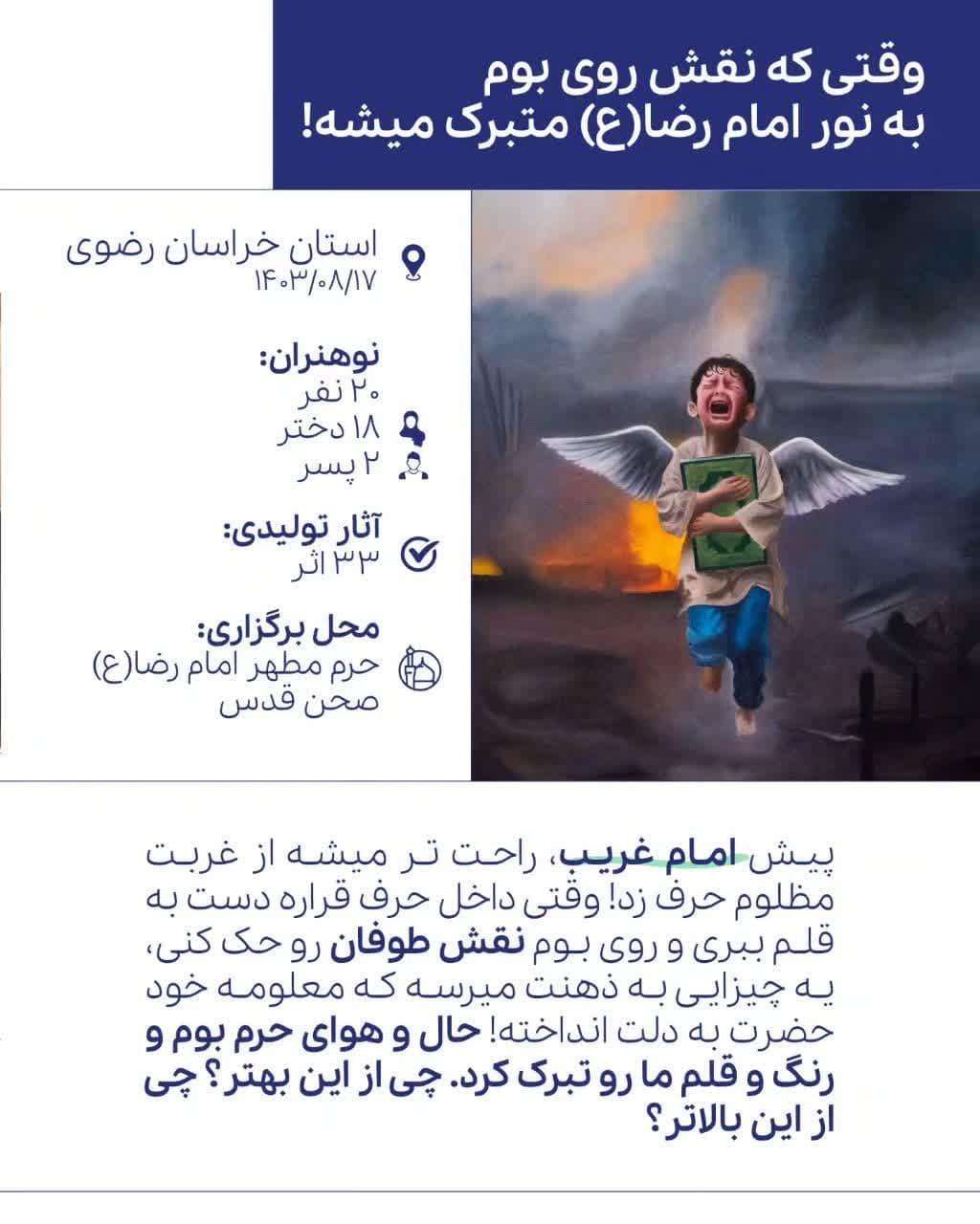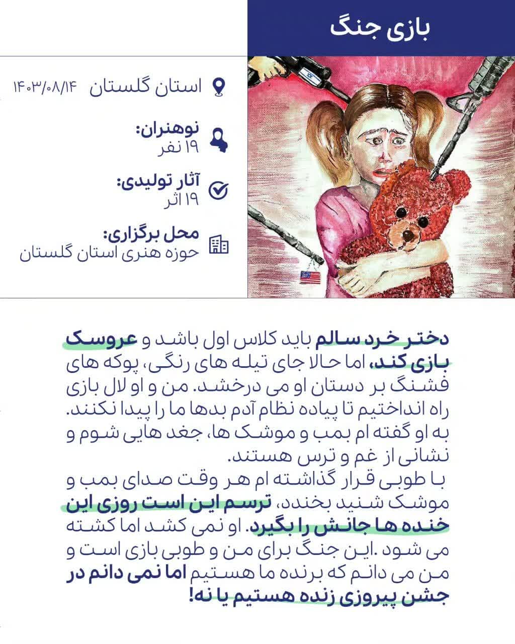 این پویش به همت مرکز هنرهای تجسمی حوزه هنری، واحد امور بین الملل حوزه هنری، مرکز رشد نوجوان امید و باشگاههای رشد نوجوان حوزه هنری در این استانها برگزار شد.