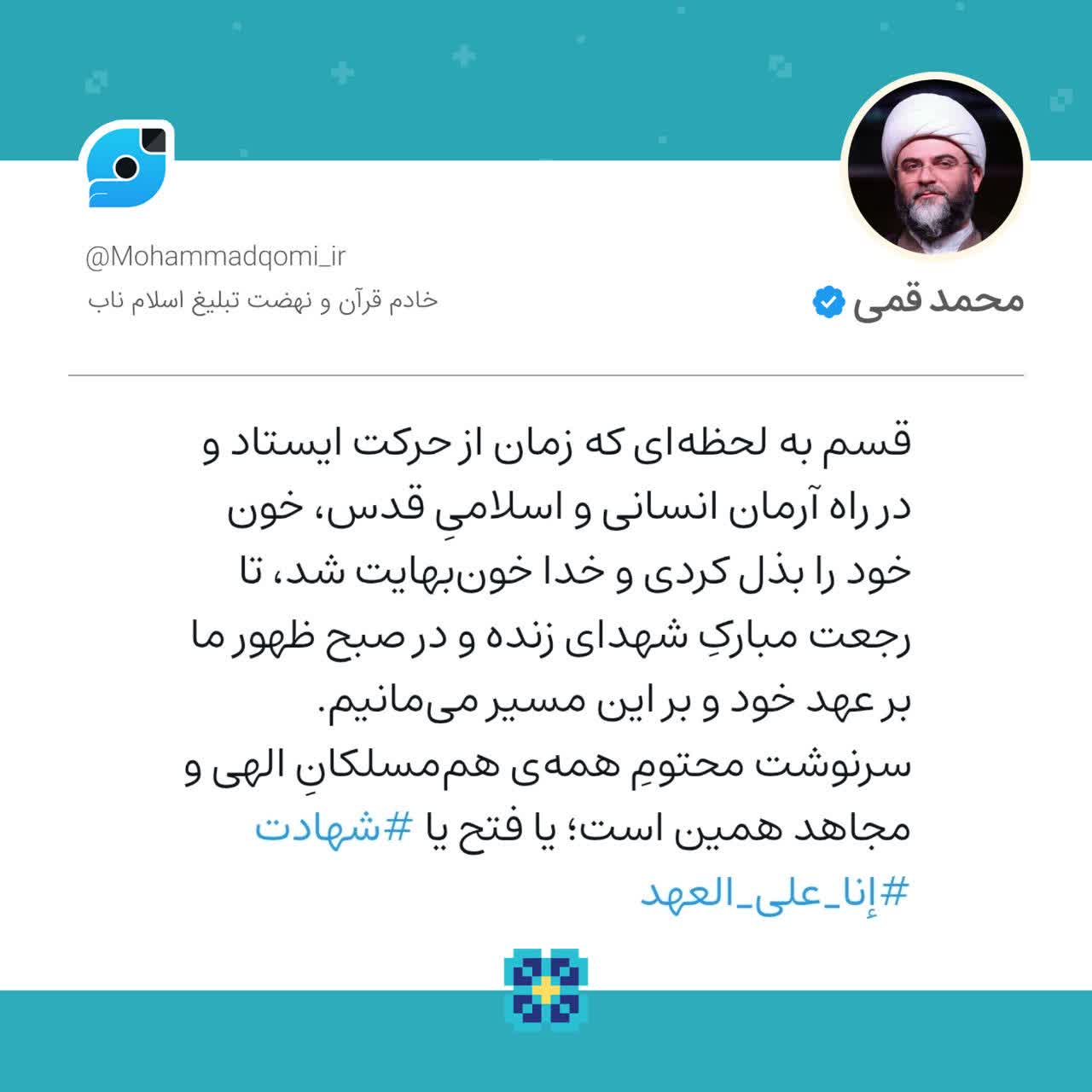 قسم به لحظهای که زمان از حرکت ایستاد و در راه آرمان انسانی و اسلامیِ قدس، خون خود را بذل کردی و خدا خونبهایت شد، تا رجعت مبارکِ شهدای زنده و در صبح ظهور ما بر عهد خود و بر این مسیر میمانیم. سرنوشت محتومِ همهی هممسلکانِ الهی و مجاهد همین است؛ یا فتح یا شهادت.