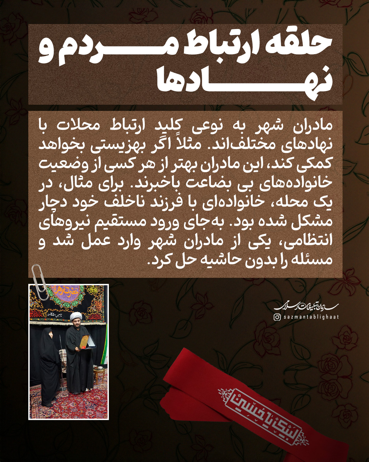به گزارش روابط عمومی سازمان تبلیغات اسلامی، در شهر سهند آذربایجان شرقی، گروهی از بانوان خیر و باتجربه با نام «مادران شهر» نقشی کلیدی در حل مشکلات محلات ایفا میکنند. این طرح که به ابتکار حجتالاسلام حیدر مسنکر، رئیس اداره تبلیغات اسلامی سهند، شکل گرفته، مادران محلی را به حلقه ارتباط میان مردم و نهادهای شهری تبدیل کرده است. از کمک به خانوادههای نیازمند و مدیریت اعتکاف گرفته تا میانجیگری در مسائل اجتماعی؛ الگویی برای حکمرانی مردمی. در این شماره از نشریه دیجیتال از سهند و طرح مادران شهر میخوانیم.