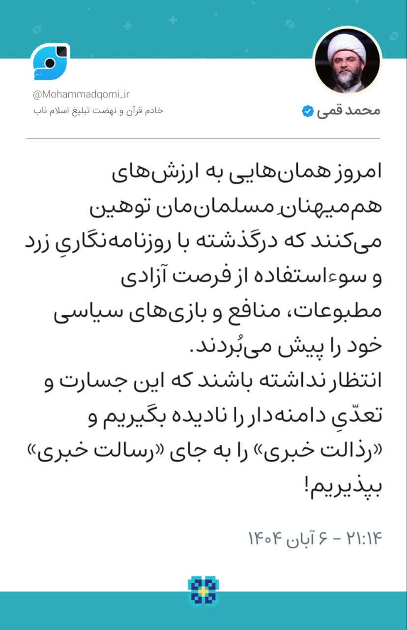 ۶ آبان | حجتالاسلام قمی در واکنش به حواشی روزنامه هممیهن نوشت؛