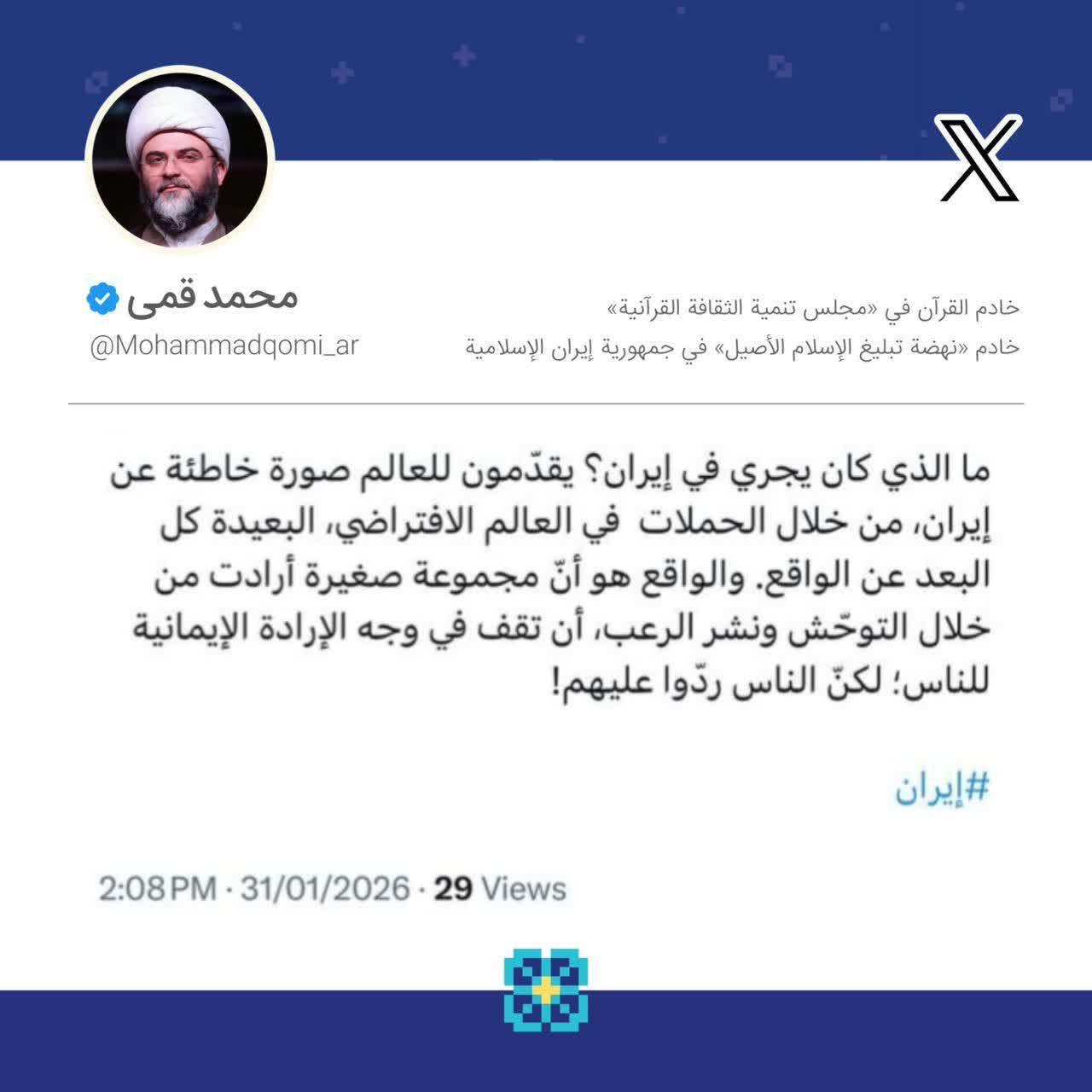 به گزارش روابط عمومی سازمان تبلیغات اسلامی، حجتالاسلام محمد قمی، رئیس سازمان تبلیغات اسلامی در صفحه شخصی خود در شبکه اجتماعی ایکس ویژه مخاطبان عرب زبان نوشت؛